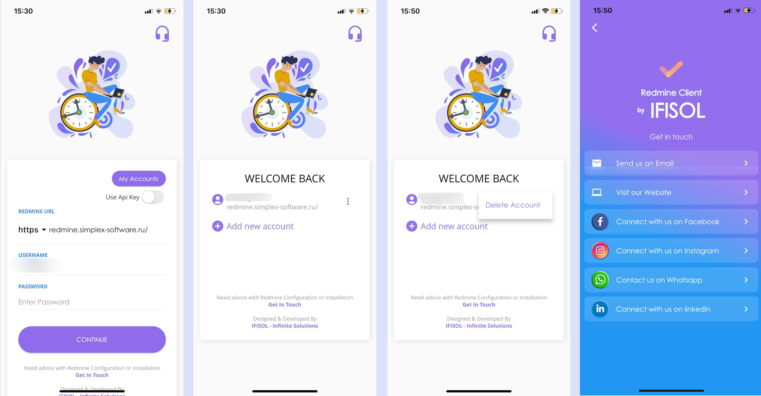 При нажатии на три точки вылезает окно удаления аккаунта. При нажатии на иконку справа вверху предоставляется информация о разработчике: ссылка на сайт и другие соц сети.
