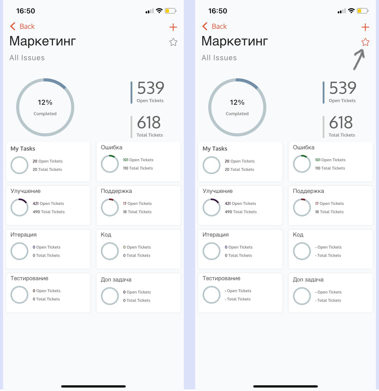 Спорный момент: хотелось бы сделать более явное обозначение, что проект добавлен в избранное. Было бы лучше, тесли менялась заливка, а не контур иконки.