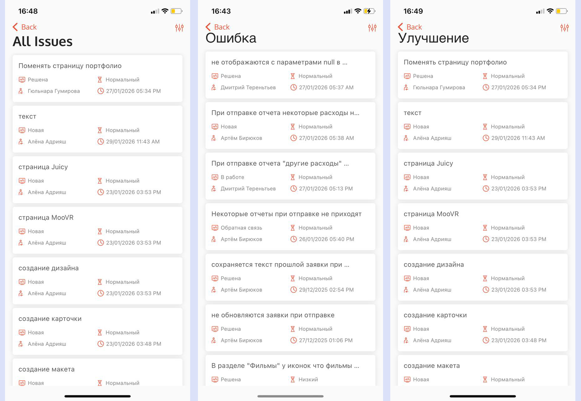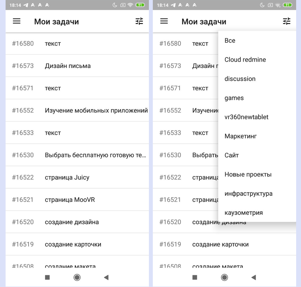 Спорный момент: нельзя создать задачу, нет поиска. Список можно отфильтровать только по проектам.