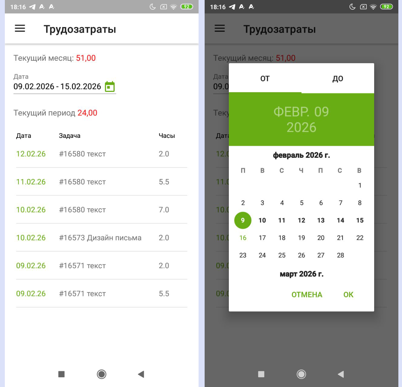 Список трудозатрат выглядит хорошо, им удобно пользоваться. Можно выбирать определённый период времени, сразу отображается сумма часов.