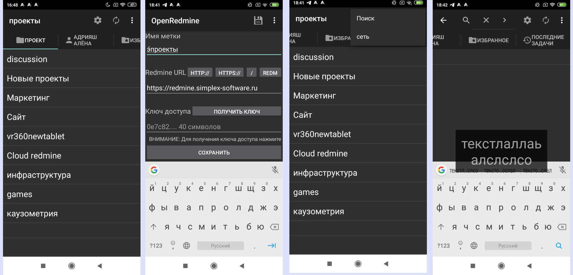 Только на этой вкладке есть возможность отредактировать аккаунт, нажав на шестерёнку. Также только здесь можно обновить страницу. Нажав на три точки, мы можем либо найти проект по названию, либо выйти в сеть Redmine. Поиск очень неудобный и выглядит поломанным: то, что ты вводишь, показывается во весь экран на прозрачной плашке.