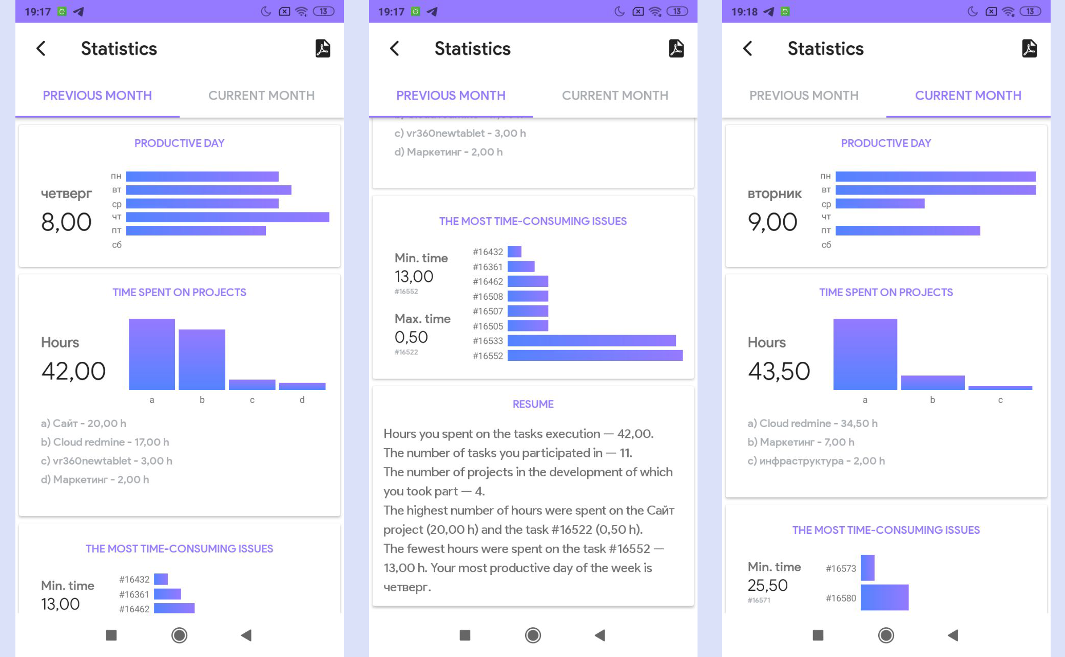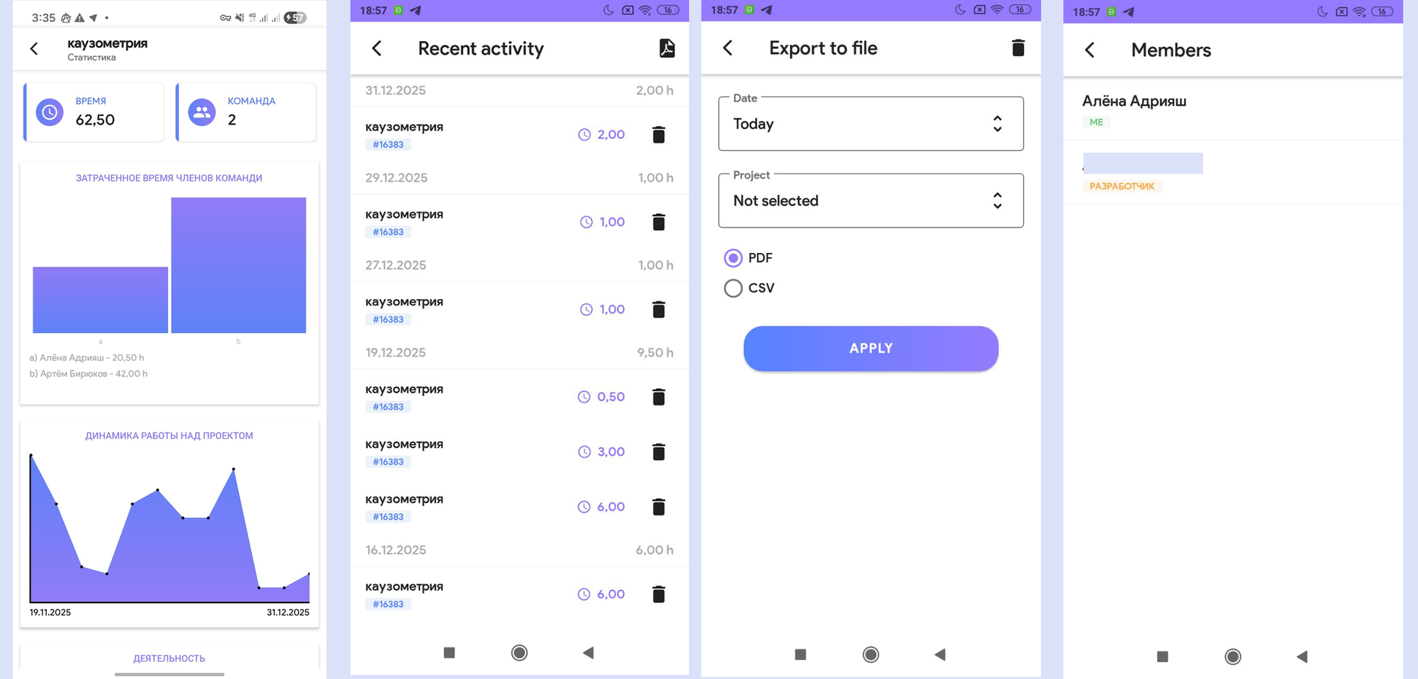 Статистика показывает несколько графиков, тут можно отследить сумму часов по каждому сотруднику и активность работы над проектом. Перейдя во время открывается список трудозатрат. Возможность экспорта приятно удивила.
