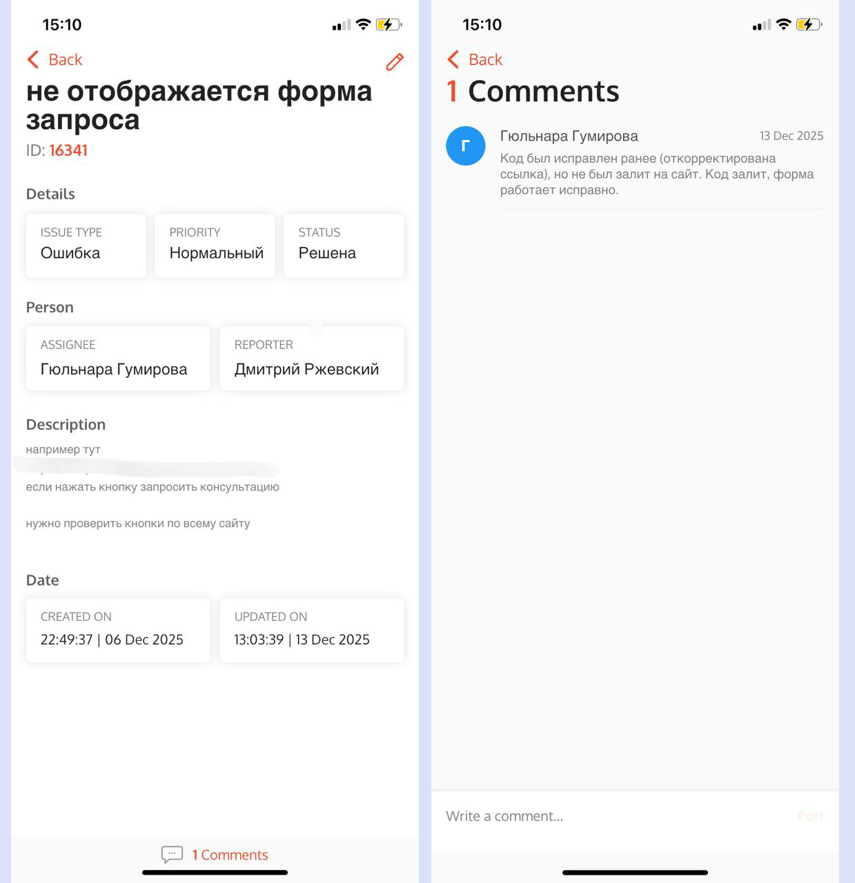 Ошибки: нельзя скопировать текст в описании задачи, ссылки не выделяются, нет возможности удалить задачу. Нет общего списка и поиска задач по всем проектам. Невозможно отследить трудозатратность по дням, не хватает общей статистики.