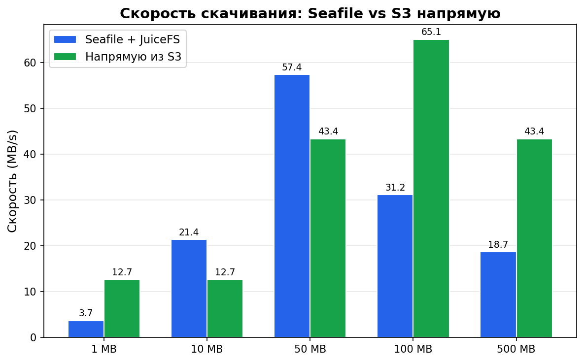 Скачивание оказалось значительно быстрее загрузки. На средних файлах (50 МБ) скорость достигала 57 МБ/с — это быстрее, чем скачивание напрямую из S3, благодаря умному кэшированию JuiceFS.