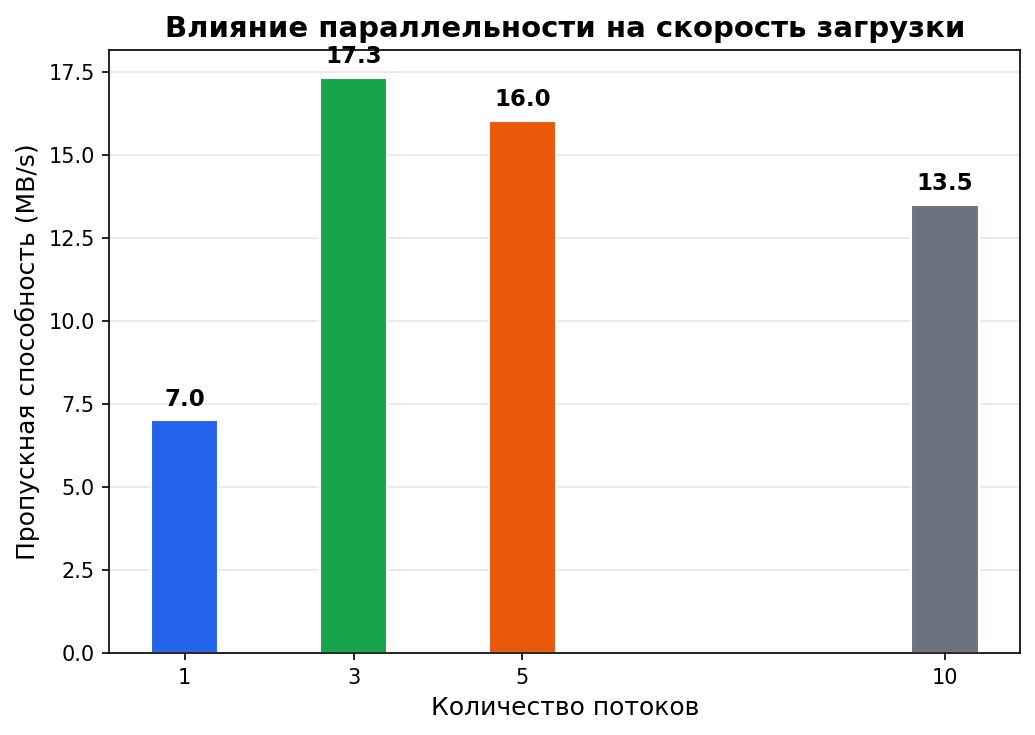 Когда несколько пользователей загружают файлы одновременно, общая пропускная способность растёт. Оптимальный результат — при 3 одновременных загрузках: скорость увеличивается в 2,5 раза.