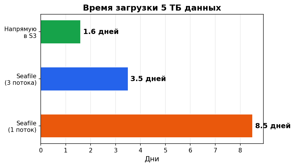 Мы измерили скорость загрузки файлов разного размера — от 1 МБ (небольшой документ) до 500 МБ (видеофайл). Средняя скорость через интерфейс Seafile составила 6,5–12 МБ/с, а напрямую в S3 — до 37 МБ/с.