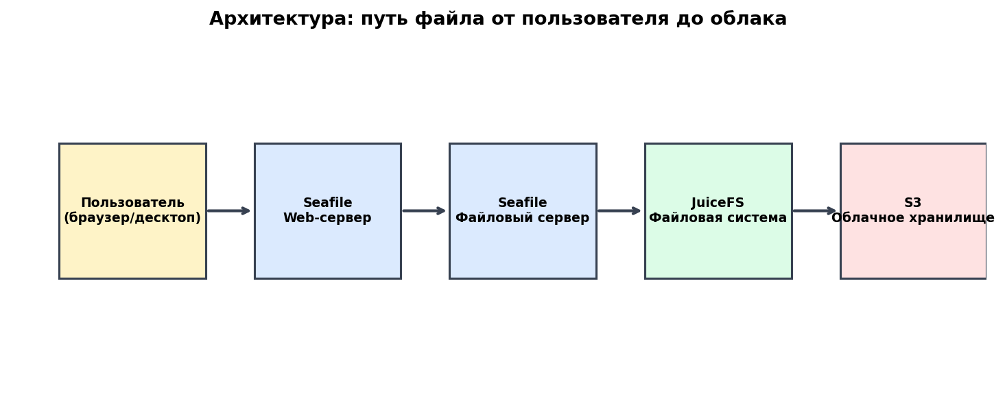Простыми словами: когда вы загружаете файл через браузер или приложение, он проходит через веб-сервер Seafile, разбивается на блоки, сжимается и отправляется в облачное хранилище S3. При скачивании происходит обратный процесс. Всё это невидимо для пользователя — он просто работает с папками и файлами как обычно.
